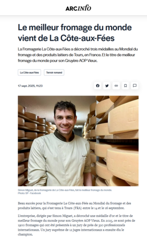 La Fromagerie de La Côte-aux-Fées a remporté un magnifique succès au Mondial du fromage et des produits laitiers à Tours !